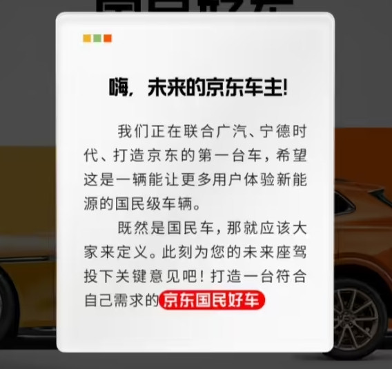 10月14日的“11.11 全球好物节发布会”上,京东宣布联合宁德时代、广汽共同推出一款“国民好车”,旨在“以全球化标准打造真正满足用户需求的高品质新能源车型”,让买车像买手机一样方便。